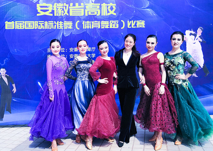 近日,2019年安徽省高校首届国际标准舞(体育舞蹈)比赛在芜湖举行。DB真人 陈晓荣、周振茂、袁玎3位教练带领DB真人 代表队夺得女子六人组摩登舞项目的冠军。