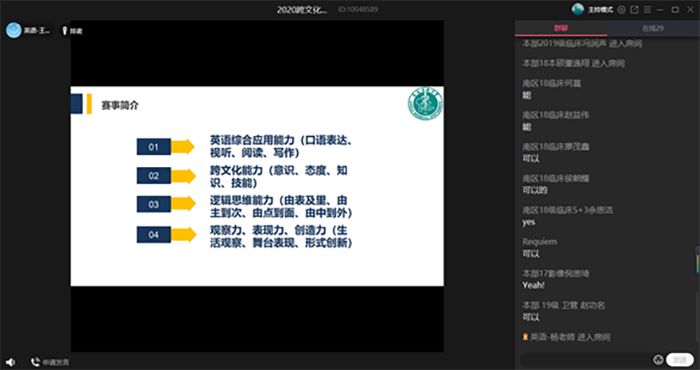 本次培训由外语系教师王然和鲁沛共同主讲,在QQ群课堂分两个阶段进行。第一阶段,主讲教师鲁沛介绍了高低语境、一元与多元时间等跨文化交际常用理论框架,为学生打下理论基础;第二阶段,主讲教师王然从赛事规则与评价标准,医学情景跨文化分析和跨文化案例分析方法三个方面做了详细讲解,并结合新冠肺炎疫情中的文化现象进行了生动解读。