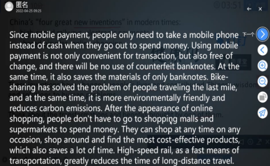 随后,鲁沛老师将较为抽象的创新学习之路具体化,引导从国家的角度思考:我国的创新科技发展有哪些?在讨论环节,鲁老师采用开放性问答进行线上互动,得到学生的广泛回应,不仅提高了课堂参与度,也锻炼了学生的段落写作能力。通过这些练习,进一步增强了学生对国家发展的认同感,激发了学生的家国情怀和文化自信。