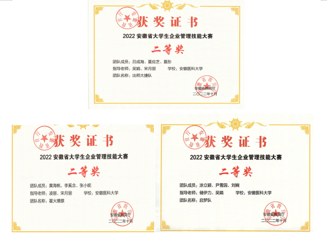 作为安徽省重要的B类赛事,本届大赛由安徽省教育厅主办、安徽财经大学承办,共有来自省内28所本科院校和16所高职院校、共127支优秀代表队、近400名同学参赛。在DB真人 DB真人 DB真人 创新创业教育课程教研室的积极组织和精心培训下,最终来自卫生管理DB真人 、第一临床医DB真人 和生物医学工程DB真人 的9名学子组建的“出师大捷队”(指导教师:吴娟、宋月丽)、“启梦队”(指导教师:储伊力、吴娟)和“星火燎原队”(指导教师:凌丽、宋月丽)分别荣获省二等奖。