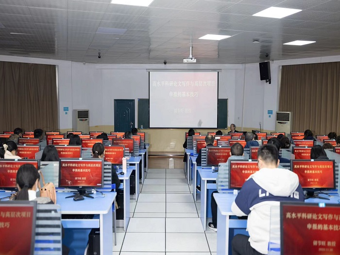 储节旺教授结合自身科研经历,从高水平论文发表和高层次项目申报两个方面展开论述,介绍了国家社科、自科、省部级项目的申请技巧,说明了哲学社会科学高水平论文写作和申报社科基金的重要意义,传授了“中华学术外译”等项目开展的经验。他还向参会教师作出针对性指导,建议大家尝试以课程思政为项目突破点进行课题申请,并激励大家在科研的道路上坚持不懈、取得成果。