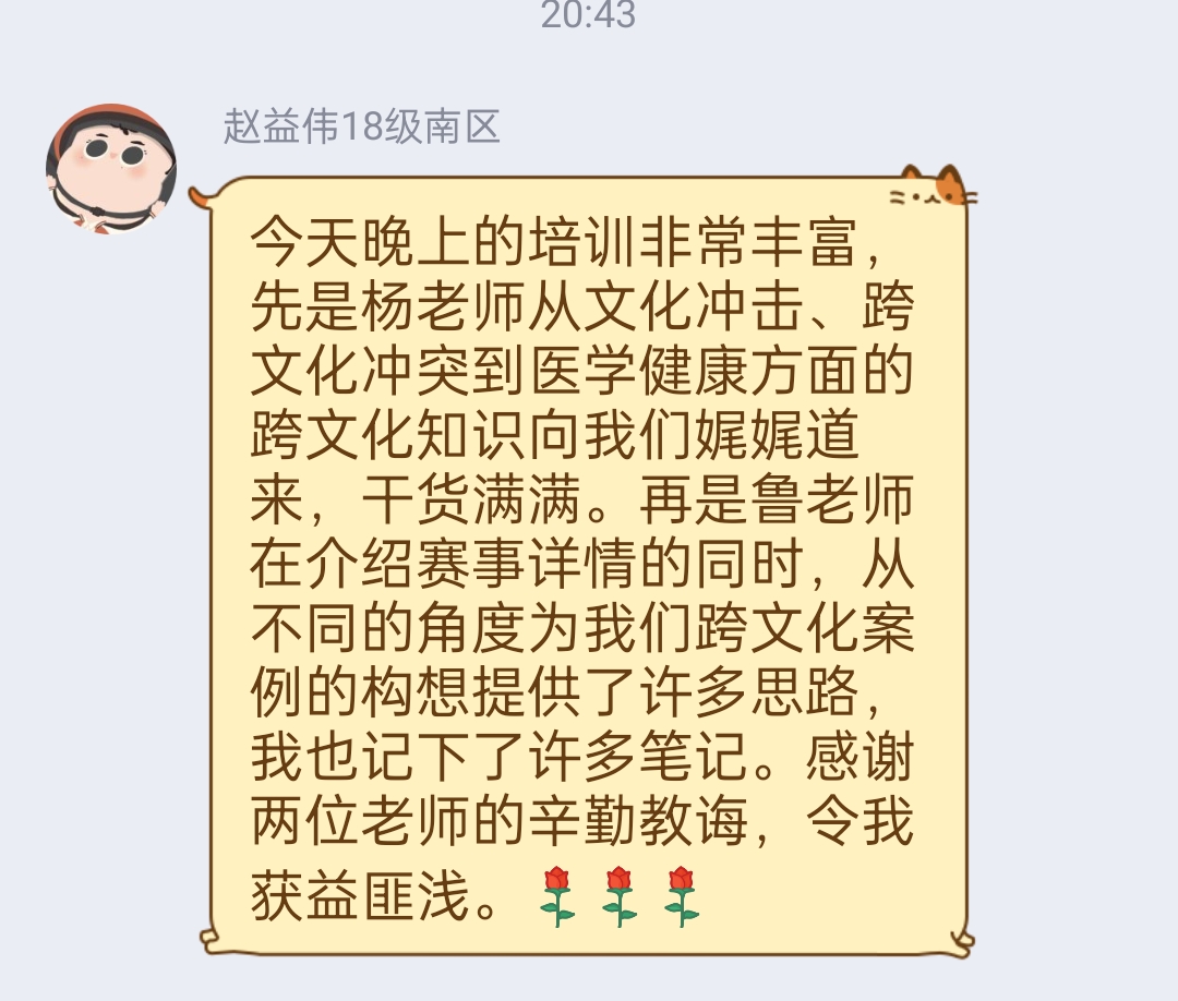 本次培训帮助参赛学生明确跨文化能力大赛比赛内容,使用具体案例从实践层面理解跨文化交际理论知识,为选手备赛加以明确指导,鼓励选手大胆创新,获得了参赛学生的良好反馈。