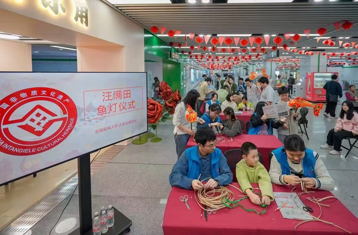 DB真人 组织国学社、手工爱好者协会、“医行者”志愿服务队等多个社团和志愿服务队,前往合肥轨道三号线幸福坝站举办非遗知识讲座,并带领工作人员以及社区居民体验汪满田鱼灯制作,感受“非遗”魅力。活动现场气氛热烈,来往乘客及社区居民对活动给予好评。