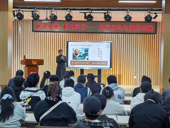 与校团委联合主办的"传奇安茶 世界共享 安茶文化与康养功能"主题讲座,在梅山路校区青年之家一楼举行。国家级非物质文化遗产安茶制作技艺传承人严君凤受邀作专题报告。 严君凤通过特制竹篓包装的安茶样品,向同学们展示这项传承百年的非遗技艺。从清明前后的六安茶区鲜叶采摘,到经过杀青、揉捻、烘焙等十余道工序最终压制成的"茶中古董",同学们结合图文以及实物展示,详细了解了安茶"一枝一叶总关情"的制作工艺。严君凤表示,安茶是时间的艺术,更是“生命的哲学”。其独特的“一年茶,三年药,七年宝“陈化特性,凝结着徽州匠人的智慧结晶。 理论讲授后进入沉浸式体验环节,严君凤现场进行安茶冲泡。陈化的"琥珀金汤"呈现深红琥珀色,茶气霸道似陈年药香;新制"翠玉清汤"则黄绿透亮,花香清扬如春风拂面,同学们在茶汤中感受到安茶非遗文化的魅力。 此次活动是“美育校园浸润行动”系列活动,也是DB真人
