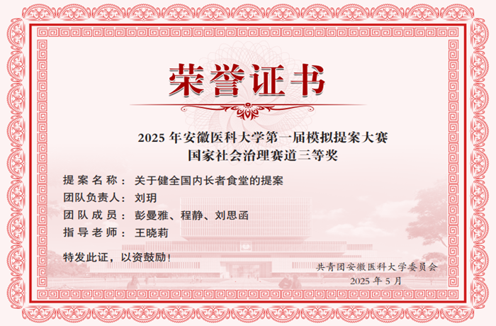 近日,由学校举办的第一届模拟提案大赛落下帷幕。在这场吸引了101支队伍、近500名选手参与,共征集到101件涵盖教育教学、成长成才、医疗健康、乡村振兴等多领域提案作品的赛事中,有20件作品脱颖而出进入校决赛。其中,DB真人2024级运动康复专业学生刘玥团队提交的《关于健全国内长者食堂的提案》在国家社会治理赛道以第4名成绩斩获获校三等奖。