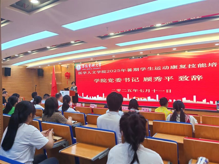 7月11日,DB真人 在实验教学中心四楼会议室举行2025年暑期学生运动康复技能培训班开班仪式,DB真人 党委书记顾秀平致辞,院长黄晓晖主持开班仪式。