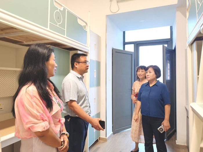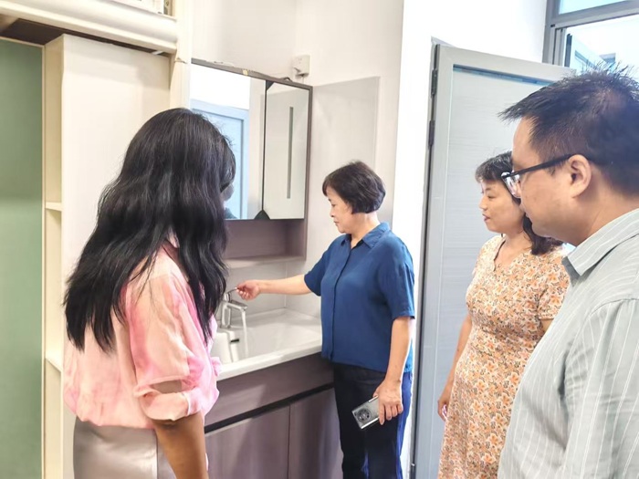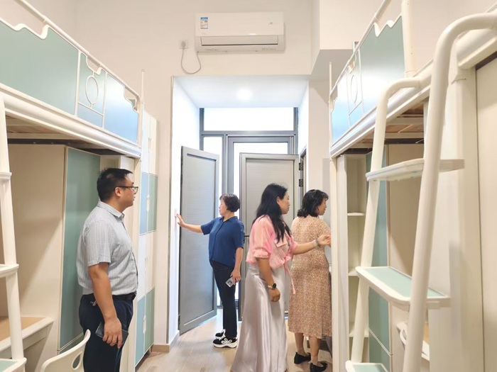 顾秀平一行深入学生公寓,对16间学生宿舍逐一细致检查。“这里的灯是否都能亮?”“空调试过了吗,制冷效果怎么样?”“每个插座都确保通电安全吗?”……检查过程中,院领导们从水电供应是否稳定正常,到每一扇门窗的闭合是否严密、锁具是否完好无损;从墙壁涂料有无空鼓脱落迹象,到天花板是否有渗水裂缝的可能;从家具桌椅是否稳固牢靠,到卫生间盥洗设施是否下水通畅、无漏水现象,仔细检查每处细节。